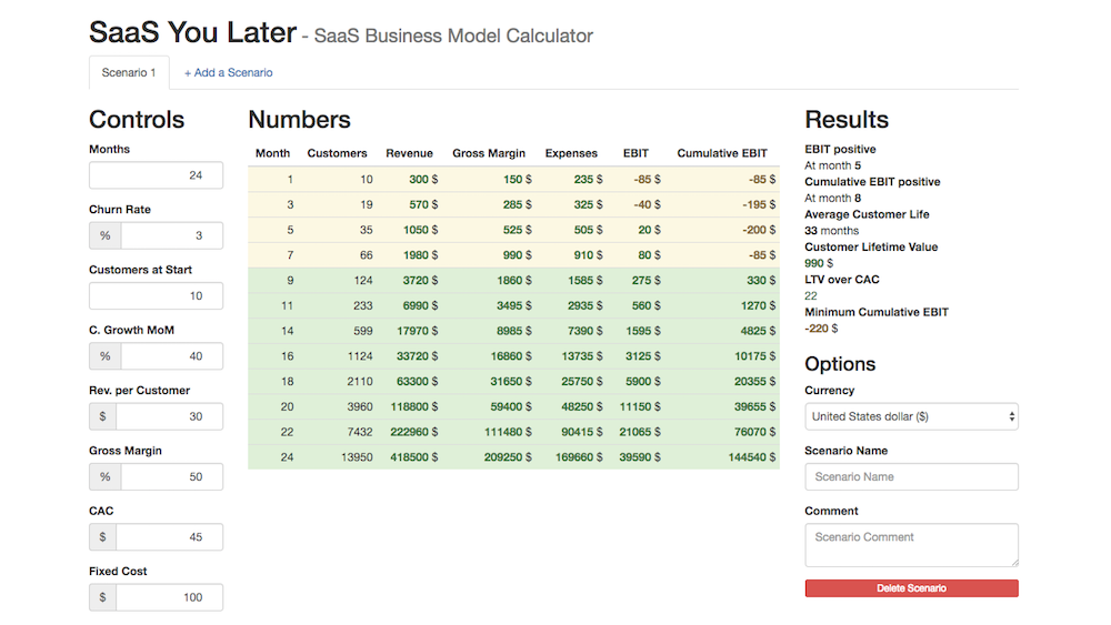 A SaaS business model calculator. Calculate your revenue, gross margin,...
