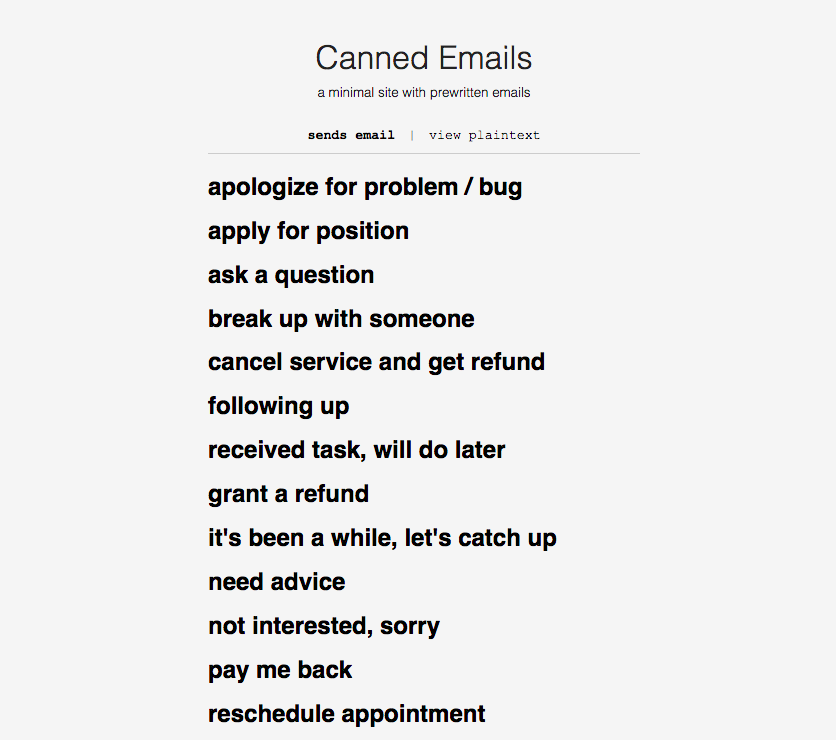 A minimal site with prewritten emails