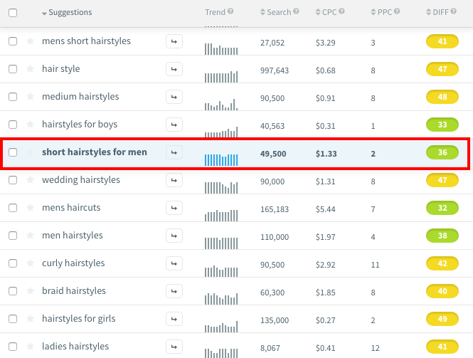 As you can see from the image above, “short hairstyles for men” is a good keyword combination to create content around it because it is trending with high monthly average search volume and low SEO difficulty.