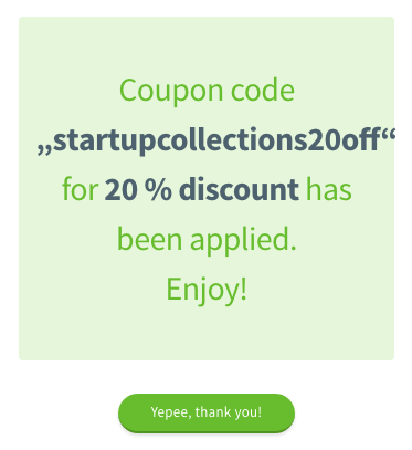 I have good news for Startup Collections visitors! Now you can use your KWFinder 20% discount coupon promo code on all plans. All you have to do is use our link to visit KWFinder website. The promo code will automatically be active and you can save 20% on all plans. Enjoy!