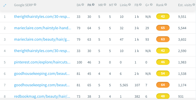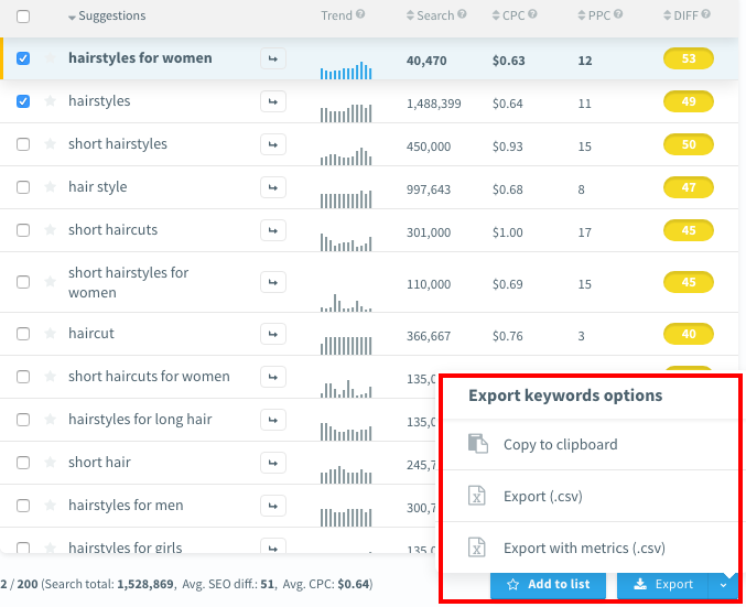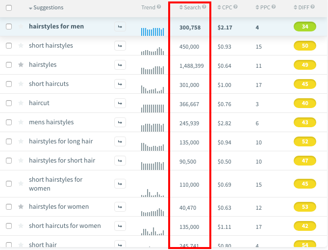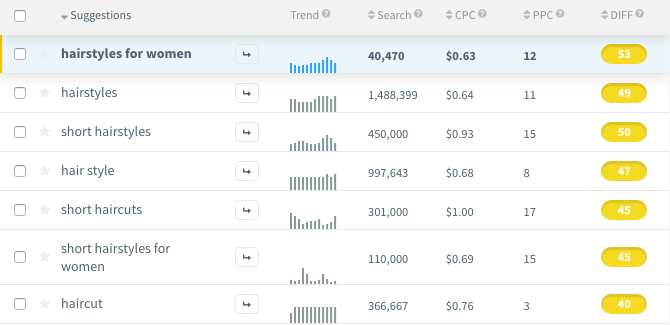 Here, I’ve searched for the term “hairstyles for women”. Now let’s look at the results from closer and try to understand what kind of metrics KWFinder gives us.