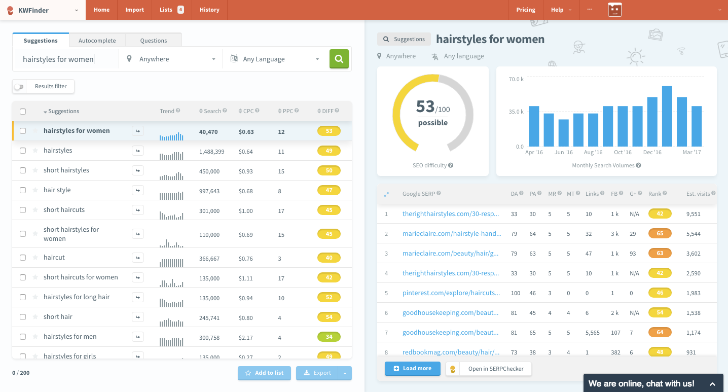 If you are creating content regularly and trying to find low competitive keywords to rank higher on Google, you should definitely try KWFinder. It is one of the best tools that I have used in keyword research so far. It has a great user interface, it is easy to use and it is fast. It is a really powerful tool with features like filtering results, finding SEO difficulty, showing exact search volume, exporting/importing keywords and making lists.
