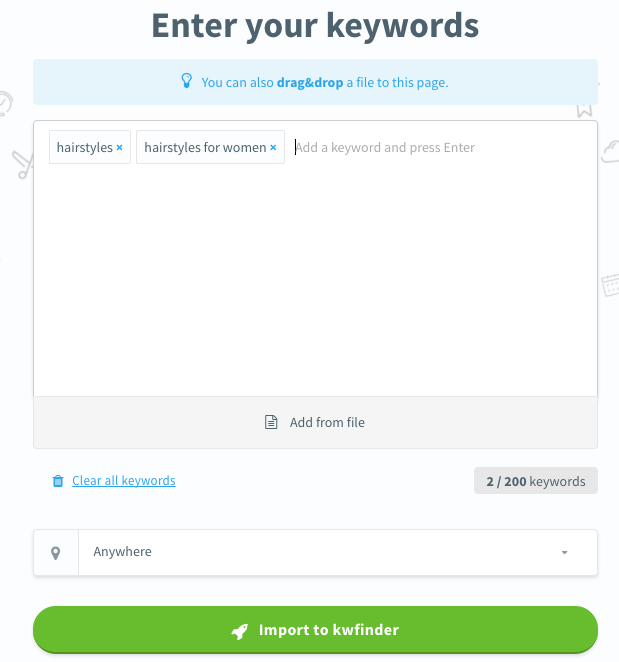 As you can understand the feature from its name, you can easily import your ready-to-use keywords into the KWFinder. You can do it in 3 ways: