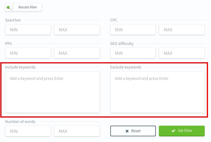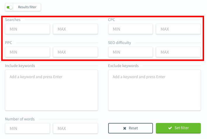 You can filter your search results based on search volume, CPC, SEO difficulty, PPC, the number of words and more.